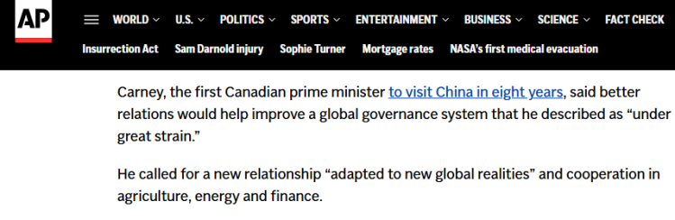 加拿大总理约翰·卡尼将于1月14日至17日对中国进行正式访问。1月16日,中加领导人会晤,引起多家外媒关注。路透社援引卡尼的声明称,加中两国正在推动建立加中新型战略伙伴关系,这将使双方通过优势互补取得“历史性”互利成果。据报道,卡尼是自2017年以来首位访华的加拿大总理,此访旨在重建与加拿大第二大贸易伙伴的关系。美联社报道重点报道了卡尼国务卿关于加中关系和全球治理的言论。他表示,改善与中国的关系将有助于完善“承受巨大压力”的全球治理体系。卡尼还呼吁两国加强农业、能源和金融领域的合作,以“适应美联社网站报道截图。报道称,“在全球贸易受到干扰的时期”,卡尼政府正在努力创建一个减少对美国依赖的经济体系。加拿大媒体报道称,卡尼在中国期间表示,从能源到农业、人文交流和多边主义等相关领域的合作将极大造福两国人民。渥太华希望此次重启能够成为“全球分裂和新时期合作共赢的典范”。加通社网站报道截图。报道称,两国签署了一系列合作文件。报道援引加拿大能源和资源部长蒂姆·霍奇森的话说:“这只是渥太华为加深两国经济一体化而努力的开始。”报道称,在中国期间,卡尼先生密集参与多次参加私人公司会议并会见了许多中国公司的高管。所有这些都表明,两国在经历了近十年的贸易、外交等摩擦之后,正在重新打开经济大门。彭博社报道指出,自去年上任以来,卡尼一直致力于重置与中国的关系,并深化加拿大与这个亚洲超级大国的贸易。 Bloomberg 谷歌网站上的报告截图。报道援引加拿大工业部长梅兰妮·乔利的话说:“事实上,与包括我们的邻国在内的一些国家相比,加拿大和中国之间的对话更加可预测和稳定。”另据彭博社报道指出,加拿大一名高级官员表示,加拿大对吸引中国资本投资可再生能源项目寄予厚望。加拿大能源和自然资源部部长蒂姆·霍奇森​​ (Tim Hodgson) 表示:“该项目将帮助我们以更低的成本实现净零排放目标,从而使加拿大受益。”nada与中国企业在电池储能方面的合作。来源:全球资讯传播