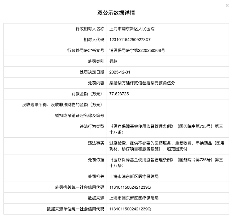 海报新闻记者近日报道,上海浦东新区医疗保障局已发布行政处罚信息。上海市浦东新区人民医院因医疗保障资金使用、管理等多项违法行为,被罚款776,237,250元。经查,上海市浦东新区人民医院存在过度检测、提供不必要的医疗服务、重复计费、替代药品(医用耗材、诊疗用品、服务设施)、超出支付范围等违法行为,违反了《医疗保障基金使用监督管理条例》(国务院令第735号)第三十八条的相关规定。上海市浦东新区医疗安全局依法为医院做出了上述优秀决定。据公开资料显示,上海浦东新区上海市人民医院(上海市浦东新区红十字医院)成立于1938年,位于上海市浦东新区川沙新城川环南路490号。是一所集医疗、教育、科研、康复、预防、健康管理于一体的三级乙等综合医院。这是上海市首批区域医疗中心建设单位之一。我是上海市浦东新区卫生健康委员会委员。现任会长为孙万柱先生。