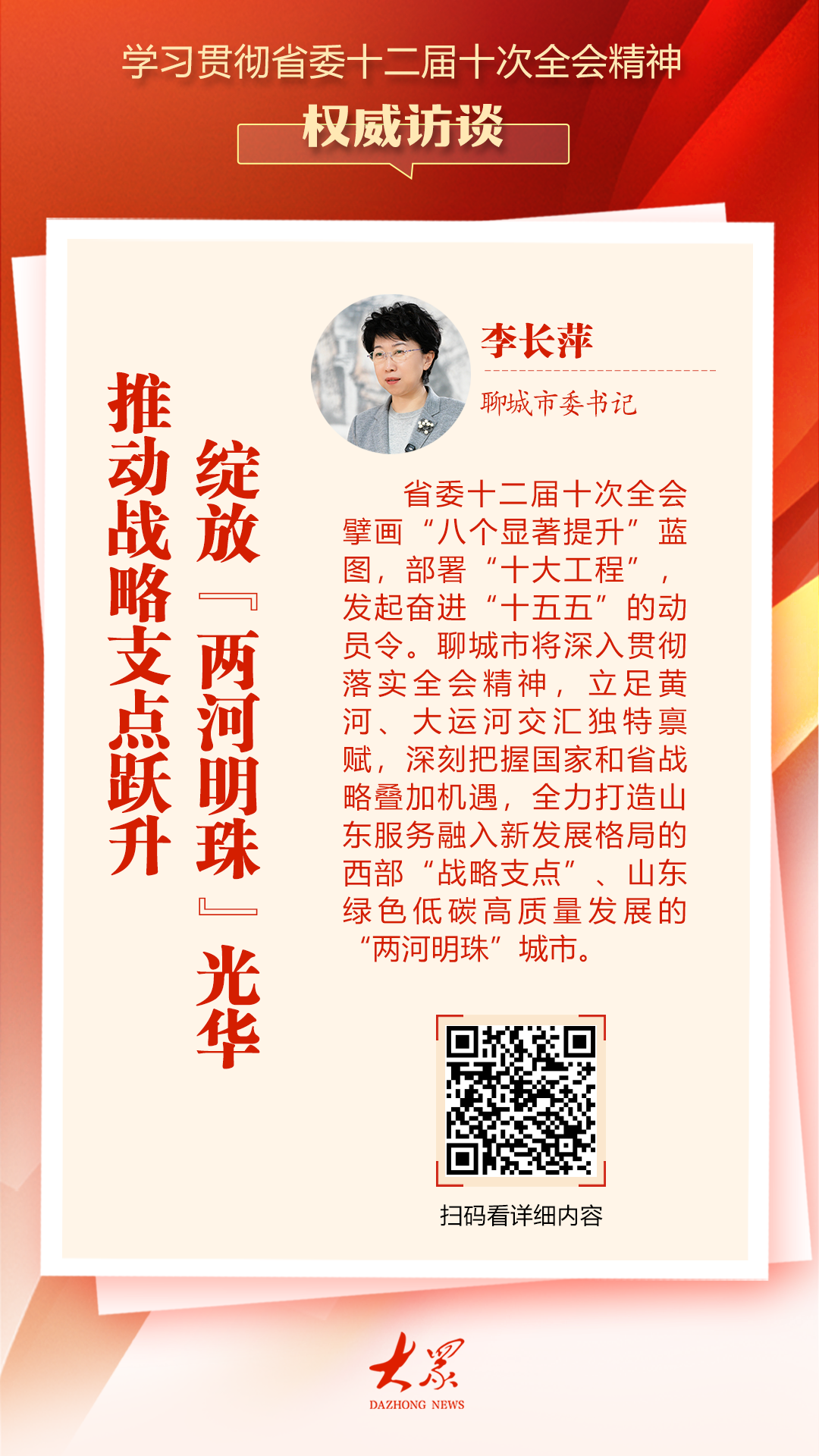 党的十二届十次全会制定了“八项重大改进”计划,制定了“十大工程”,发出了“十五五”规划动员令。聊城市将全面贯彻落实会议精神,立足黄河与大运河交汇处得天独厚的区位优势,深入抓住国家与省域战略重叠机遇,着力构建“战略格局”。打造鲁西融入新发展格局的“支点”,打造山东省绿色低碳高质量发展的“两江明珠”城市。一是提升产业精细化,强化发展主引擎。狠抓工业经济“一号工程”,实施一系列龙头工程和规模化工程,深入推进智能化、绿色化、一体化发展大力发展十二大产业,加快培育新生产力。以服务业扩能提质为重点,大力发展赛事经济、渠道经济、医疗健康经济,激发消费新可能。我们要全面担负起米袋、菜篮子稳定生产供应责任,兴农业当龙头,拓展链条,打造品牌,把农业打造成现代重大产业。二是强化战略地位,扩大城市影响力。加快建设连接济正高铁、雄山高铁、聊城机场和“城际双高速公路”的立体交通网络,推进现代供水网络建设,完善冷链物流和多式联运体系,努力构筑聊城市开放“滩头阵地”。西边是山东省。用好中国太平洋气候变化中心、跨境电子商务综合试验区等国家平台,推动“海关物流中心+内陆港”协同,大力拓展全球市场,全面提高对外开放水平。三是改善人民生活福祉,塑造幸福新形象。加强普惠基础综合生活建设,进一步提高公共服务水平,建设老年友好城市。加快城乡一体化发展,有序开展城市更新行动,提高城镇化发展质量,推动乡村平原乡村振兴,在高质量发展中促进共同富裕,确保发展成果更加公平惠及全体人民。旅程就在前方,谁先努力,谁就是第一。聊城乘风破浪」のsuタートで主导権を握り、山东省が北部地域の重要な経済成长极を构筑する取り组みに贡献する。 (记者胡磊、薛良成编辑)