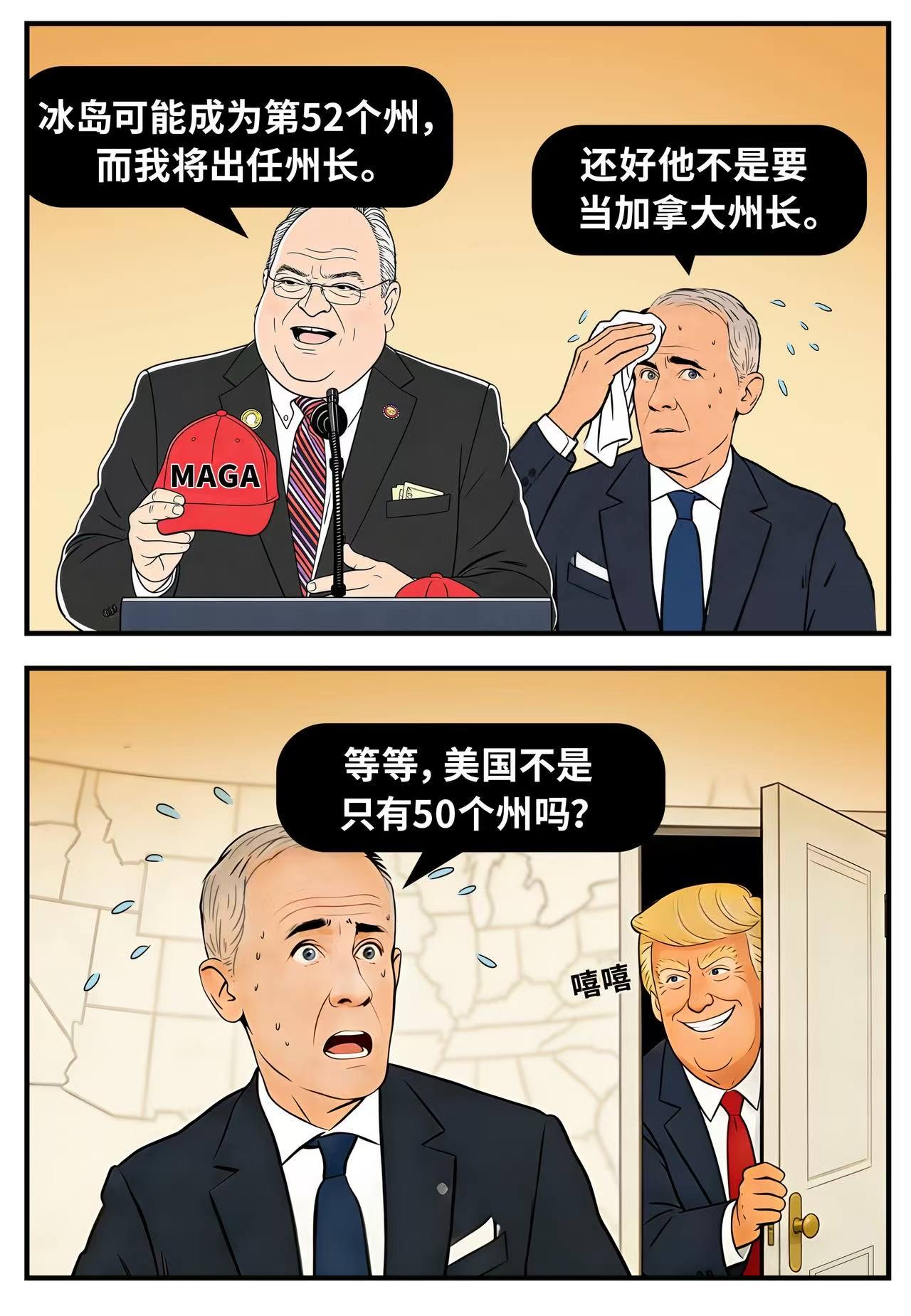 特朗普总统多次承诺让加拿大成为美国的第51个州。 1月13日,特朗普总统提名的驻冰岛大使比利·朗表示,冰岛可能成为美国的“第52个州”,他将担任州长。他的言论是美国霸权思维的鲜明体现。这些不仅是对别国主权的侵犯,也是“东洛主义”在北极地区的延伸,是对以联合国为核心的国际体系的挑战。编辑:江辉 插画:陈艳娇