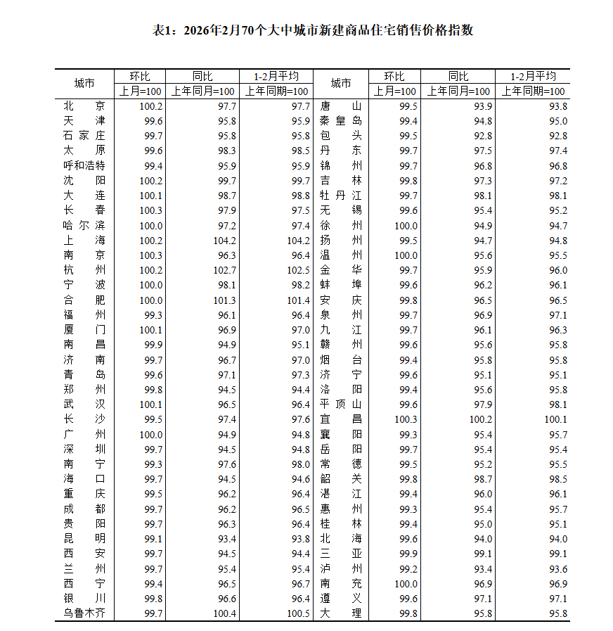 海报新闻首席记者 张文 济南报道 3月16日,全国70个大中城市公布了2026年2月商品住宅销售价格走势。 2月份商品房销售价格环比降幅继续收窄。其中,山东省、济南市、青岛市、烟台市、济宁市4个统计城市新建住宅和二手住宅价格继续下降。记者发现,2026年2月,纳入统计的70个大中城市中,除上海、杭州、合肥、乌鲁木齐、宜昌外,有65个城市新建住宅价格低于去年同期。此外,统计覆盖的70个大中城市中,除北京、上海、沉阳、厦门以外的66个城市现房价格自上月以来出现下降,统计覆盖的70个大中城市全部较去年同月下降。河表1:2026年2月70个大中城市新建商品住宅销售价格指数。据统计,新建商品住宅价格方面,2月份济南市环比下降0.3%,同比下降3.3%。青岛销售额环比下降0.4%,同比下降2.9%。烟台市环比下降0.6%,比去年同月下降4.2%。济宁市销售额环比下降0.4%,比去年同月下降4.9%。从现有住宅价格看,2月份济南市环比下降0.2%,同比下降5.4%。青岛销售额环比下降0.6%,同比下降6.9%。烟台市环比下降0.7%,比去年同月下降7.0%。济宁市销售额环比下降0.6%,比去年同月下降7.0%。表2:2026年2月70个大中城市现房销售价格指数nalist查阅国家统计局数据发现,济南新建住宅价格2023年2月至2023年7月持续上涨,2023年8月至2025年1月持续下跌。2月结束连续下跌,3月继续上涨,4月与上月持平,2025年5月继续下跌。2026年2月。2023年上半年青岛新建住宅价格持续上涨, 7月份停止了连续上涨,2024年8月至11月继续下跌,2024年12月停止了连续下跌。2025年1月继续上涨,2月与1月相同,3、4月继续上涨,5月与上月相同,今年6月至2月继续减少。年。 2021年9月至2023年1月,济南市二手住宅价格连续17个月下降。 17连跌于2023年2月结束。3月继续上涨d 四月。 2023年5月至2025年2月再次下跌,3月份停止连续下跌,今年4月至2月继续下跌。青岛市现房价格2023年4月至2024年12月持续下跌,2025年1月结束连续下跌,今年2月至2月继续下跌。国家统计局城市司首席统计师王中华解释,2026年2月整体来看,70个大中城市商品住宅销售价格环比持续下降,同比降幅也收窄。新建商品住宅销售价格环比上涨或持平的城市数量比上月有所增加。其中,商品住宅销售价格环比降幅继续下降。 2月新品在一线城市上市 家居销售价格环比下降0.3%后保持稳定。其中,北京、上海上涨0.2%,广州持平,深圳下跌0.3%。二、三线城市新建商品住宅销售价格环比分别下降0.2%和0.3%,降幅均收窄0.1个百分点。 70个大中城市中,新建商品住宅销售价格环比上涨的城市有10个,持平的城市有7个,环比上涨的城市共有9个。 2月份,一线城市二手房销售价格环比下降0.1%,降幅比上月收窄0.4个百分点。其中,北京、上海分别增长0.3%和0.2%,广州、深圳分别下降0.5%和0.4%。二、三线二手房销售价格城市环比分别下降0.4%和0.5%,降幅均收窄0.1个百分点。商品住宅销售价格也较去年同期有所下降。 2月份一线城市商品房销售价格比去年同月下降2.2%,降幅比上月扩大0.1个百分点。其中,上海上涨4.2%,北京、广州、深圳分别下跌2.3%、5.1%和5.5%。二、三线城市新建商品住宅销售价格比上年分别下降3.1%和4.0%,降幅分别扩大0.2%和0.1个百分点。 2月份一线城市二手房销售价格同比下降7.6%,降幅与上月持平。其中,北京、上海、广州、深圳分别下降8.4%、6.2%、8.5%和7.1%, 分别。二线城市成屋销售价格同比下降6.2%,降幅与上月持平。三线城市成屋销售价格比上年下降6.3%,降幅扩大0.2个百分点。