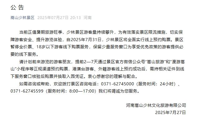 广告:这是夏季游客最多的季节,而莎洛林风景秀丽的地方的游客人数仍在不断增长。为了有效地在风景秀丽的位置实施流量限制测量,有效地保证了旅游安全并改善了路线的经验,Shaolin的风景场所将在2025年7月31日完全实施购买在线门票。旅游景点将暂停购买18年的旅游票,以保留必要的渠道,以提供必要的台阶,以提供一小部分服务。提前2-7天通过官方渠道购买早期订单并购买门票,例如风景优美的官方账户,例如“ Songshan旅游”和“漫游Songshan”。在成功预订了外国游客和香港,澳门和台湾的游客之后,他们必须转到OFF -LINE服务窗口以验证门票并验证交换入场证书。感谢您的理解与合作。如果您需要咨询或帮助,请致电现场风景景点的直接咨询线:0371-62745000(服务时间:24小时)和0371-62745599(服务时间:8:00-17:00)。我会全心全意为您服务。 Henan Songshan Shaolin文化旅游有限公司2025年7月27日(Songshan Shaolin风景区域)